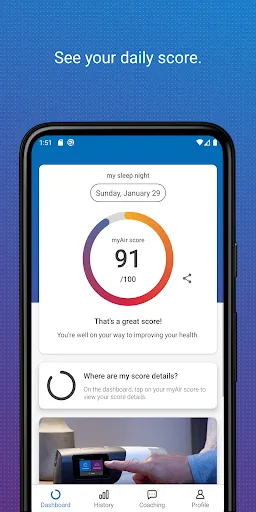myAir™ app offers personalized guidance and tips to help you get started with your mask. This app can sync with your CPAP machine and send your sleeping data to your smart devices. It also integrates with Apple Health to track your overall health data. Start to use myAir™ and sleep wel